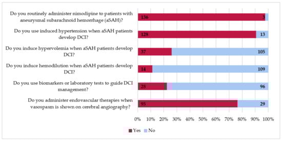 DCI is an important and much studied complication after aSAH, occurring in approximately 30% of patients [33]. Treatment of DCI includes hemodynamic and mechanical endovascular therapy or direct infusion of vasodilating drugs to reverse vasospasm. Despite a lack of evidence from randomized controlled trials to support use of any of these treatments and evidence for an increased risk of complications, our survey study showed that induced hypertension (91%), induced hypervolemia (26%), and induced hemodilution (11%) were frequently used. Interestingly, we observed an increased preference for using induced hypertension alone compared to previous survey research, which has found up to half of respondents use induced hypertension, hypervolemia, and hemodilution combined as treatment of DCI [15,19,34]. Our survey study underscores the variability in the management of DCI in patients with aSAH.