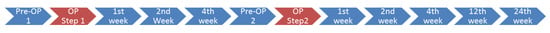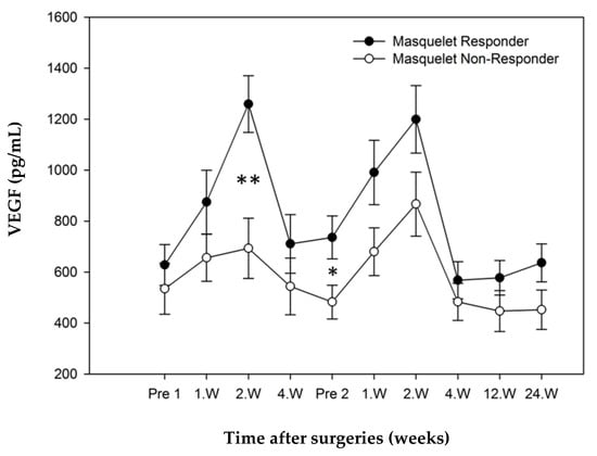 During the whole course of observation, VEGF values for “responders” were higher than those of “non-responders”. Both groups showed peak values 1–2 weeks after respective surgeries. A significantly higher value could be seen in the responder group in the second week following step 1 (p = 0.005). Additionally, this group showed a significantly elevated value immediately before step 2 surgery (p = 0.044). The development of VEGF showed no significant values after step 2 surgery (Figure 6).