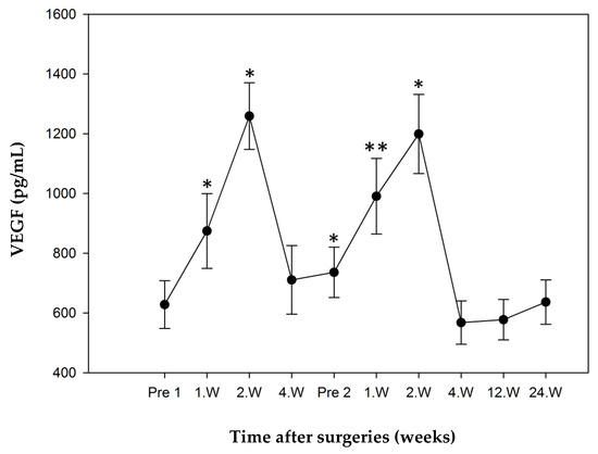 VEGF mean concentrations over time (error bars: standard error of the mean, * significant p < 0.05, ** very significant p < 0.01). Significant differences between both study groups in week 2 after step 1 and preoperative step 2.
