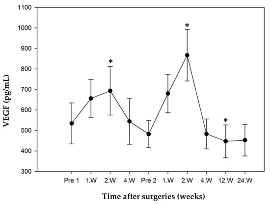 VEGF mean concentrations in non-responders over time (error bars: standard error of the mean, * significant p < 0.05), all values compared to Pre 1 (preoperatve value prior to step 1). VEGF levels were significant higher in the second week after step 1 and step 2. Maximum concentration of VEGF at second week after step 2.