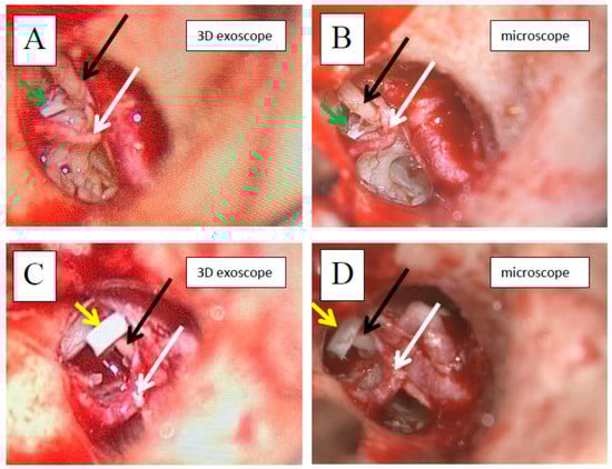Intraoperative view during stapedotomy (right ear, endaural approach); A and B—tympanic cavity after tympanomeatal flap elevation, C and D—tympanic cavity after suprastructure of stapes removal and stapes prosthesis insertion; A and C—with the exoscope, B and D—with the microscope; long process of incus (black long arrow), chorda tympani (white long arrow), stapedial muscle tendon (green short arrow), stapes prosthesis (yellow short arrow). Images shown are 2D representations.