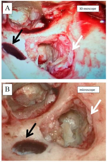 Intraoperative view during cholesteatoma surgery (left ear, retroauricular approach); antromastoidectomy performed, cholesteatoma partially removed, cholesteatoma matrix visible (white arrow), sigmoid sinus partially exposed (black arrow); A—with the exoscope, B—with the microscope. Images shown are 2D representations.
