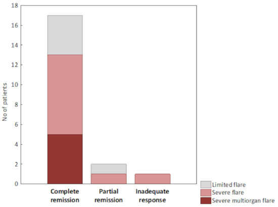 | —severe multiorgan flare | n (%) | 5 (25%) |