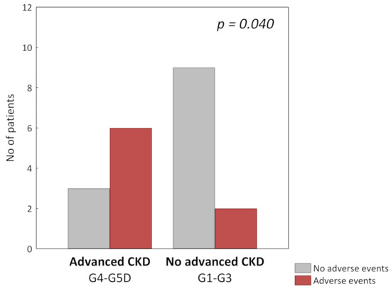 | eGFR (mL/min/1.73 m2) G1-G3: ≥30 G4-G5D: <30 | n (%) n (%) | 9 (75%) 3 (25%) | 2 (25%) 6 (75%) | 0.040 # |