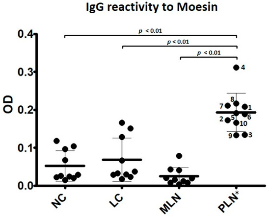 3.2. Autoantibodies to Moesin Are Elevated in PLN, Not MLN