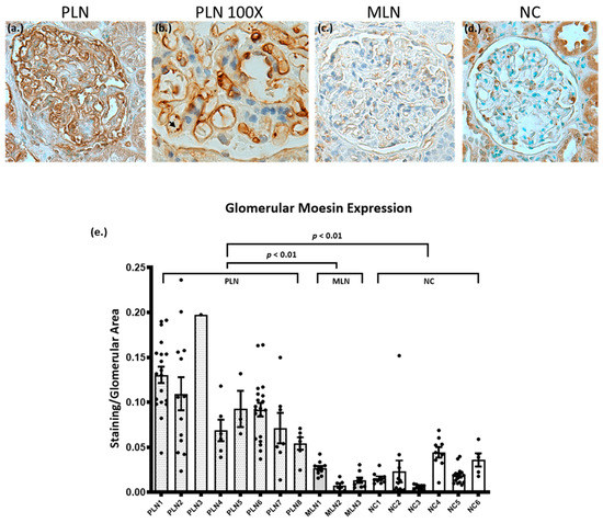 Known target antigens in glomerular diseases are frequently characterized by increased glomerular expression on kidney biopsy [22,42,43]. To further assess moesin as a target antigen in PLN, immunohistochemical (IHC) staining for moesin was performed on human kidney biopsies from patients with PLN (N = 8), MLN (N = 3), and normal controls (NC, N = 6). Moesin IHC demonstrated strong global granular capillary loop staining in PLN. There was also staining in podocytes and parietal epithelial cells (Figure 3a,b). Moesin staining in MLN demonstrated faint capillary loop staining in a pattern similar to NC (Figure 3c,d). NC also showed staining of podocytes and parietal epithelial cells (Figure 3d). Glomerular moesin staining was quantified and normalized to glomerular area. Glomerular staining was significantly increased in the PLN samples by one-way ANOVA (p = 0.001) and there were significant differences between PLN and MLN (p = 0.006) as well as PLN and NC (p = 0.003), as verified with Tukey HSD test (Figure 3e).