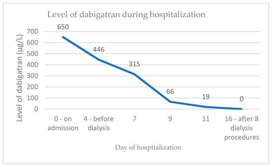 Since gross hematuria and occult gastrointestinal bleeding were present, dabigatran was discontinued immediately. The serum concentration of dabigatran was highly elevated (650 µg/L). However, she was not treated with idarucizumab (reversal agent for dabigatran) since the bleeding was not considered life-threatening. Due to a further decrease of renal function and a high concentration of dabigatran (446 µg/L), dialysis was started. Eight dialysis procedures altogether were necessary to decrease the level of dabigatran to within the reference range (Figure 1). The thrombin time was also significantly reduced, from over 150 s, measured at admission, to 21.9 s (reference range below 21 s).