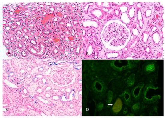 Light microscopy kidney biopsy findings: (A) Signs of acute tubular injury, occlusive red blood cell casts in the tubules, and diffuse interstitial edema (hematoxylin and eosin stain; original magnification × 200). (B) Mild glomerular segmental mesangial proliferation—mild IgA nephropathy and signs of acute tubular injury (hematoxylin and eosin stain; original magnification × 200). (C) Hemosiderin intracytoplasmic deposition in tubular epithelial cells (confirmed by Perl’s stain, original magnification × 200). (D) Occlusive red blood cell (RBC) casts not containing Tamm Horsfall protein (arrow; original magnification × 400).