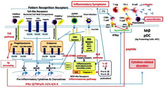 The innate immune system recognises external stress factors (infection factors such as viruses and bacteria) as PAMPs (PAMPs: pathogen-associated molecular patterns), and inner stress factors (damaged cells and dead cell debris; mitochondrial fracturing products; etc.) as DAMPs (damage-associated molecular patterns) through TLRs and NLRP(NOD-like receptors)-3 inflammasome complex activation. As for the DNA of viruses and bacteria, they are recognised through the cGAS-STING (cyclic GMP-AMP synthase (cGAS) STING) pathway, while viral RNA is recognised through the RLR (Retinoic Acid-Inducible Gene-Like Receptors) pathway. As a result, proinflammatory cytokines and interferons are produced by activating transcription factors such as NF (nuclear factor) κB, AP1 (activator protein 1), and IRF (IFN regulatory factor)-3/7 with intracellular transmission mechanisms. (ASC: apoptosis-associated speck-like protein containing a CARD; pDC: plasmacytoid dendritic cells; MΦ: macrophage)