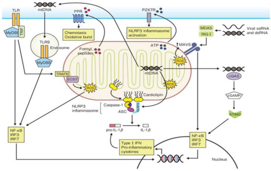 NLRP3 is also present in mitochondria, and together with the production and secretion of IL-lβ and IL-18, the cells are brought to pyroptosis, a form of programmed cell death. This process prevents the further intracellular proliferation of viruses. Furthermore, mitochondrial fracturing products and mitochondrial DNA contribute even more to the activation of innate immunity [24].