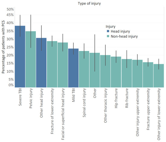The mean total RPQ score was 4.9 (SD: 7.8) (Table 1). The prevalence of PCS in our study population was 22.0%. Of patients with head injury, 28.4% had PCS compared to 20.6% of patients with non-head injuries (p = 0.009). Additionally, 40.4% of patients with two or more chronic diseases were classified as having PCS compared to 14.5% for patients without chronic diseases and 28.3% for patients with one chronic disease (p < 0.001). Patients with PCS had a significantly lower educational level compared to patients with no PCS (p = 0.001). Road traffic accidents were more prevalent among patients who reported PCS (p < 0.001). Of patients with severe TBI (n = 55), mild TBI (n = 145), and other head injuries (n = 36), respectively, 38.2%, 24.1%, and 30.6% had PCS (Figure 1). PCS was also common under patients with pelvic injuries (34.8%) and fractures of lower extremity (28.7%). Of patients with non-fracture injuries of the lower extremity, the least number of patients had PCS (14.5%).