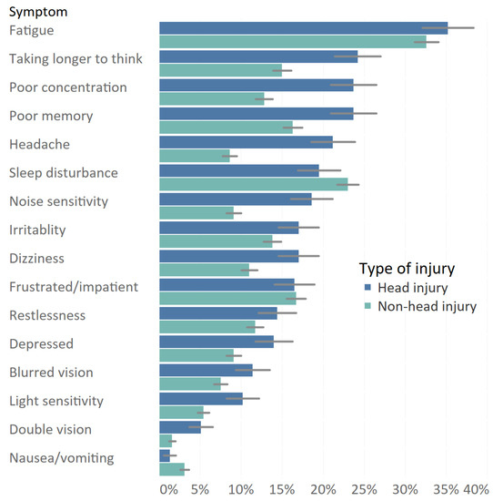 Nearly half (48.3%) of patients reported experiencing at least one post-concussion symptom at 1 year post-injury. The most frequently reported symptom by patients with and without head injury was fatigue; respectively, 35.2% and 32.6% of patients had these symptoms (Figure 2). Additionally, taking longer to think (24.2%), poor concentration (23.7%), and forgetfulness (23.7%) were most common in patients with head injury. The most common symptoms for non-head injury patients apart from fatigue were sleep disturbance (23.0%), feeling frustrated or impatient (16.7%), and forgetfulness (16.3%). Patients with head injury showed significantly more feelings of headache, dizziness, noise sensitivity, depression/tearful, poor memory, poor concentration, taking longer to think, light sensitivity, blurred vision, and double vision symptoms compared to patients with non-head injury (p < 0.05). For mild TBI patients (n = 144), fatigue (32.4%), taking longer to think (23.4%), poor concentration (20.7%), poor memory (20.7%), headache (20.7%), and sleep disturbance (20.0%) were the most common post-concussion-like symptoms. For severe TBI patients, fatigue (47.3%), poor concentration (32.7%), poor memory (32.7%), taking longer to think (30.9%), noise sensitivity (27.3%), and irritability (27.3%) were most frequently reported.