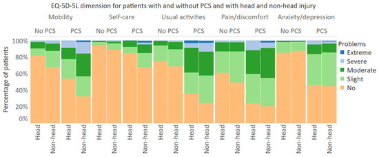 Frequency of responses to EQ-5D-5L of patients with and without head injury, by PCS status. PCS: Post-concussion syndrome (≥3 of the core post-concussion symptoms).