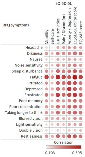 Correlation of RPQ items and EQ-5D-5L dimensions and EQ-5D-5L utility and EQ VAS scores.