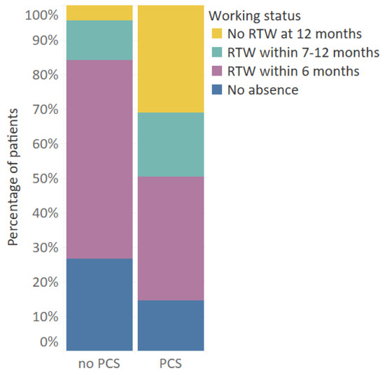 Figure 5 shows the return to work rates after injury. More than 90% of patients returned to work within 12 months after injury. However, there was a significant difference in return to work rates between patients with and without PCS. Most patients without PCS returned to work within 6 months (84.2%), while only half of patients (50.5%) with PCS returned to work within 6 months (p < 0.001). Additionally, nearly a third of patients (31.1%) with PCS were not able to return to work within 12 months after injury, compared to only 4.3% of patients without PCS (p < 0.001). There was a moderately strong association between PCS and no RTW within 6 months and 12 months (respectively, φ = 0.325, p < 0.001 and φ = 0.360, p < 0.001).