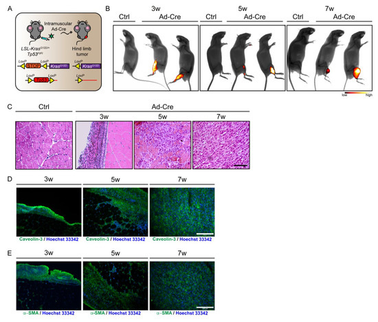 Consistent with the analysis of tumor growth by FMT, H&E staining revealed tissue alterations characterized by many interstitial cells already surrounding myofibers at the three-week time point. The observed modifications become more evident at the five-week time point. Seven weeks after Ad-Cre infection, the tumor was fully developed, highlighting major changes occurring between the fifth and seventh weeks. Indeed, after the five-week time point, the typical skeletal muscle tissue organization was no longer detectable, and spindle-shaped rhabdomyoblast cells, with high eosinophilic cytoplasm, had completely replaced myofibers in the seven-week tumor mass (Figure 1C).