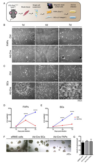 Ad-Cre SCs and Ad-Cre FAPs (2 × 104) and eRMS cells were seeded in 6-well ultralow attachment microplates (Corning, USA) for 7 days. A DMEM/F12 serum-free medium (Invitrogen, USA #11330057) containing 5 μg/mL insulin, 20 ng/mL epidermal growth factor (EGF), 2% B27 and 20 ng/mL basic fibroblast growth factor (bFGF) was used to culture the spheres.
