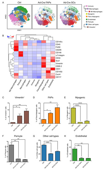 In the latter, we identified a FAP-like population including cells coexpressing Sca1, CD90.2, Vimentin, CD140α and CD34 [15,34,35,36,37,38,39,40,41,42]. We also recognized myogenic-like cells that expressed α7-Integrin and Cxcr4 (C-x-c chemokine receptor type 4, also known as CD184) and a pericyte-like population characterized by CD146 and CD140β expression [37,43,44,45,46]. We also labeled a cluster as endothelial cells, since it contained cells expressing the two endothelial markers CD31 and CD117 [47,48,49,50]. The antigen profile of four minor additional clusters was also highlighted. They were dubbed as “other cell types” (Figure 2B), and their variation in time is shown in Supplementary Figure S2A,B.