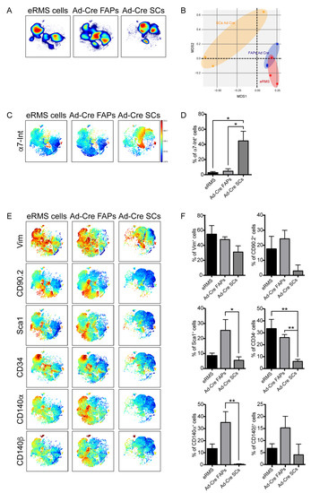 Mass cytometry antigenic-profile comparison of eRMS cells and Ad-Cre FAPs and Ad-Cre SCs. (A) Representative viSNE contour plots showing cell-density distribution of eRMS cells and Ad-Cre FAPs and Ad-Cre SCs (red: high density; blue: low density). (B) Multidimensional scaling plot (MDS) of eRMS, Ad-Cre FAPs and SCs. (C) Representative viSNE maps colored according to the expression level of α7-Integrin marker (blue: low expression; red: high expression). (D) The bar plots quantitate the percentage of cells positive for the expression of the α7-Integrin marker. (E) Representative viSNE maps showing the expression level of the indicated marker. (F) The bar plots quantitate the percentage of cells positive for the expression of the analyzed marker. (D,F) Cell percentages were assessed on the total number of cells in each sample (n = 3). The statistical significance was estimated by one-way ANOVA. All data are represented as mean ± SEM, and the statistical significance was defined as * p < 0.05; ** p < 0.01.