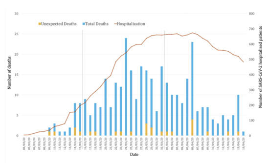 In-hospital mortality in patients with SARS-CoV-2 infection during the study period. The daily number of unexpected deaths (yellow), non-unexpected deaths (blue) and number of COVID-19 hospitalized patients are represented and divided by fortnight.