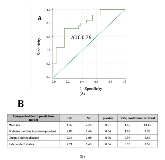 Unexpected death prediction model. (A) Represents the ROC curve with an area under the curve (AUC) of 0.75. Below, (B) Represents in a table the multivariable analysis with the corresponding values of odds ratio for each one of the four variables included in the model and their respective confidence intervals and p-values. OR: odds ratio, SE: standard error.