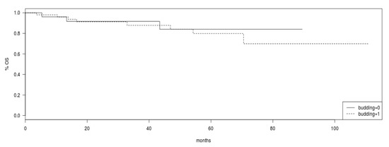 Overall survival (OS) in the group of patients with tumor budding (intermittent line) versus patients without tumor budding (continuous line). Log Rank p = 0.8.