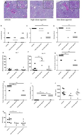 EP4 receptor agonism improved the phenotype of nephrotoxic serum nephritis (NTS). Fourteen days after NTS induction, kidneys of mice treated with vehicle, high-dose EP4 receptor agonist, or low-dose EP4 receptor agonist were harvested, and PAS-staining was performed (A). Representative pictures are shown. Stained kidney sections were quantified for glomerular and kidney damage (B–D). Urine samples collected on day 7 (E) and 14 (F) were analyzed for albumin and creatinine. In order to quantify for tubular damage acute tubular injury score (G) and tubular cast formation, six high-power fields (HPF) (H) were evaluated. Venous dilatation score (I) was quantified. Serum neutrophil gelatinase-associated lipocalin (NGAL) levels (J) and serum blood urea nitrogen (BUN) levels (K) were evaluated on day 14. (* p ≤ 0.05, *** p ≤ 0.001).