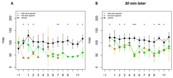 Hypotensive episodes occurred after EP4 receptor agonist administration. Blood pressure was assessed in vehicle- (n = 4), EP4 receptor high-dose agonist- (n = 4), and EP4 receptor low-dose agonist- (n = 4) treated mice after NTS induction. Blood pressure was measured via the tail cuff method immediately (A) and 30 min after EP4 agonist injection (B) in all three groups. Mean arterial pressure (MAP) is represented as mean ± SEM. Statistical significances are provided compared to vehicle-treated mice (* p ≤ 0.05, ** p ≤ 0.01, *** p ≤ 0.001).