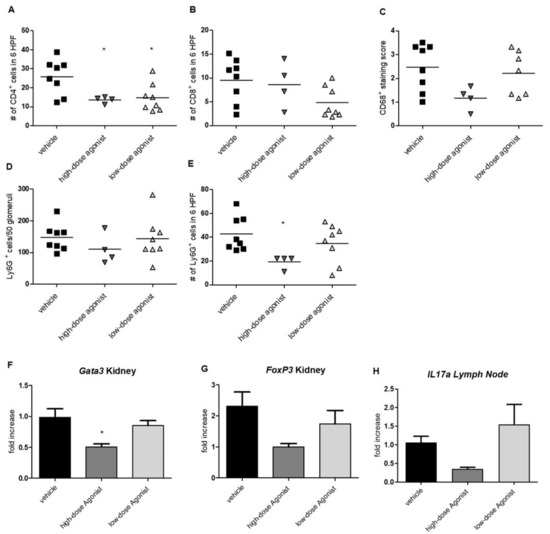 Effects of EP4 agonism on kidney-infiltrating immune cells. Fourteen days after induction of NTS, renal infiltration of CD4+ (A), CD8+ T cells (B,) and CD68+ macrophages (C) were evaluated in mice treated with high- and low-dose EP4 receptor agonist compared to vehicle. Ly6G+ (Gr1) cells were evaluated in glomeruli (D) and the interstitium (E) on day 14 after NTS induction. Fourteen days after NTS induction, quantitative PCR was performed to evaluate Gata3, FoxP3, and Il17a expression in the kidney and lymph node (F–H) in mice treated with vehicle (n = 6), high-dose EP4 receptor agonist (n = 3–4), and low-dose EP4 receptor agonist (n = 7–8). Results were compared to the kidneys of healthy mice (n = 3). Data are provided (mean ± SEM) as fold increase compared to healthy kidneys. Means are indicated by a horizontal line. Statistical significances are provided compared to vehicle-treated mice (* p ≤ 0.05).