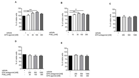 EP4 receptor agonism increases tubular proliferation in vitro. To evaluate proliferative capacity of DCT cells, the MTS test was performed. DCT cells were treated with vehicle, EP4 receptor agonist (A), PGE2 (B), EP4 receptor antagonist (C), and the EP4 receptor antagonist together with PGE2 (D), as well as EP4 receptor antagonist together with EP4 receptor agonist (E) under starving conditions for 72 h. Data are provided as mean ± SEM from at least five independent experiments. Statistical significances are provided compared to vehicle-treated cells (** p ≤ 0.1, *** p ≤ 0.001).