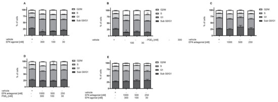 EP4 agonist treatment significantly decreased cells in the sub-G1 phase and increased cells in the G1 phase of DCTs. To evaluate cell viability, a cell-cycle analysis was performed. DCT cells were treated with vehicle (n = 7), EP4 receptor agonist (n = 6–7) (A) PGE2 (n = 5–6) (B), EP4 receptor antagonist (n = 5–6) (C), and the EP4 receptor antagonist together with PGE2 (n = 6–7) (D) or together with the EP4 receptor agonist (n = 4) (E) under starving conditions for 72 h. Data are shown as mean ± SEM. Statistical significances are provided compared to vehicle (* p ≤ 0.05, ** p ≤ 0.01).