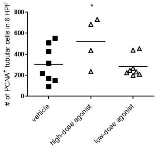 EP4 agonist-treated mice showed increased proliferation of tubular cells in vivo. Fourteen days after NTS induction, mice treated with vehicle, high-dose EP4 receptor agonist or low-dose EP4 receptor agonist were evaluated for PCNA+ tubular cells per six high power fields (HPF). Means are indicated by horizontal lines. Statistical significances are provided compared to vehicle-treated mice (* p ≤ 0.05).