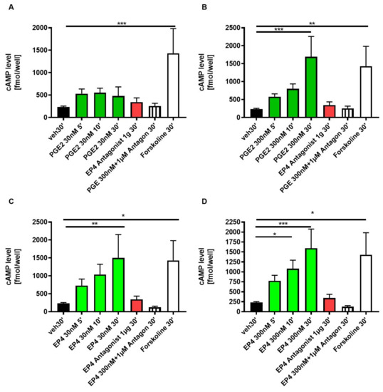 EP4 stimulation of DCTs with ONO AE1-329 (30 nmol/L or 300 nmol/L) significantly increased cAMP production DCTs. Cells were treated with either PGE2 30 nmol/L (A) or 300 nmol/L (B), EP4 antagonist ONO AE3-208 (1000 nmol/L), or EP4 agonist ONO AE1-329 30 nmol/L (C) or 300 nmol/L (D). As a control, cells were either not treated (veh) or as a positive control with Forskoline (FSK). Cells were lysed, followed by a 5-, 10- or 30-min incubation before assay. Experiments were performed in duplicates. In total, at least five different experiments were performed. Statistical significances are provided compared to vehicle (* p ≤ 0.05, ** p ≤ 0.01, *** p ≤ 0.001)).
