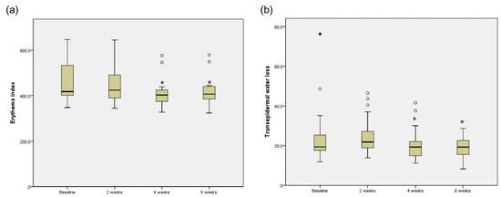 Erythema index (a) and TEWL (b) at baseline, 2 weeks, 4 weeks, and 6 weeks after treatment with dual-frequency ultrasound. The boxes show the interquartile range and the bars inside the box represent the median value. The outside rhombus and circles indicate the lowest and highest data. * p < 0.05.