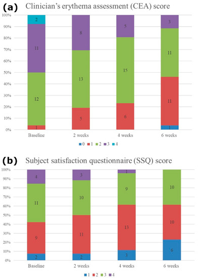 (a) Clinician’s erythema assessment (CEA) score and (b) subject satisfaction questionnaire (SSQ) score. CEA value was significantly decreased from the baseline 2.53 to 1.61 at 6 weeks follow-up (p < 0.001). The SSQ scores also significantly decreased from the baseline 2.65 to 2.15 at 6 weeks follow-up (p = 0.003).