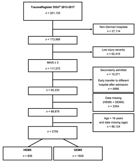 Study flow chart illustrating the selection of patients. MAIS: Maximum Abbreviated Injury Scale; HEMS: Helicopter Emergency Medical Service; GEMS: Ground Emergency Medical Service.