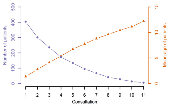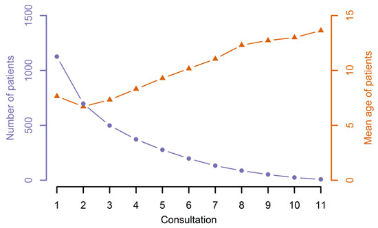 Follow-up visits of all patients within the observation period. The number of patients and their mean age according to the number of total consultations, which varied between 1 and 11, are shown.