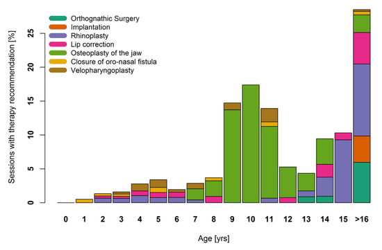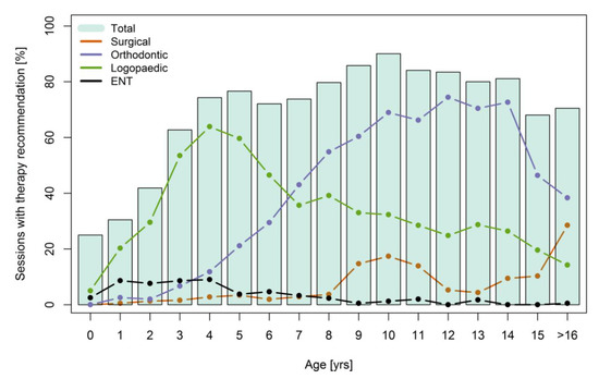 We can also infer that the recommendations given by specialty professionals in our multidisciplinary setting changed continuously over the first 16 years of life. Speech therapy was the most commonly recommended up to the age of six, followed by orthodontic treatment. These findings were to be expected because of the drawn-out time span of these therapies [3,13,14,15,16]. This also emphasizes the importance of a close monitoring of and early therapy for speech development disorders [17,18].