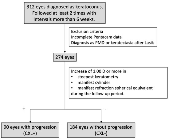 CXL treatment was applied to eyes with recently active keratoconus that showed significant keratoconus progression, based on aforementioned criteria by corneal specialists. Eyes that underwent CXL were assigned to the progression group; eyes that did not undergo CXL were placed in the non-progression group (Figure 1).