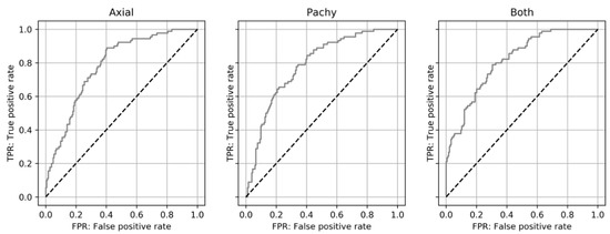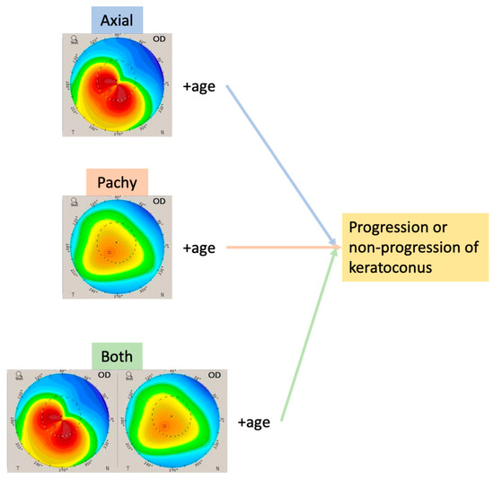 We created an AI model to predict conical cornea progression with an axial map (Axial), a pachymetry map (Pachy), and their lateral combination (Both) taken at the first visit, using a Pentacam HR instrument; the assessments were based on patients’ age (Figure 2).