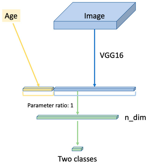 After five convolutional blocks, the global average pooling layer is passed, such that spatial information is removed from the extracted features. After the global average pooling layer, we combined the standardized age information. The ratio of the amount of age information to the amount of image information is referred to here as the parameter ratio, described below. The extracted features were then compressed by passing through the fully connected layers. The last fully connected layer with the activation function, Softmax, evaluated the probability of each class (i.e., the two groups comprising the progression group and the non-progression group). The number of units in the hidden layer (n_dim) is described below.