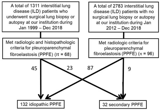 Pleuroparenchymal fibroelastosis (PPFE) was first reported as a unique pleuroparenchymal lung disease in 2004 [1]. Idiopathic PPFE has been reported to account for approximately 6–8% of all interstitial lung diseases; however, the true prevalence of PPFE is not known. Several recent studies have explored and documented the possible etiologies of secondary PPFE, including radiation [1], bone marrow or stem cell transplantation [2,3], lung transplantation [2,4], connective tissue diseases [5,6,7], asbestosis [8], pneumoconiosis [8,9], metal lung [10,11], recurrent infections (e.g., pulmonary aspergillus [12] or Mycobacterium avium intracellular complex [13]), chemotherapeutic agents [14,15], and chronic hypersensitivity pneumonitis (HP) [12,16,17]. The diagnosis of secondary PPFE is challenging because of the contraindications for surgical lung biopsy. Surgical lung biopsy is associated with risks such as a potentially prolonged period of post-operative iatrogenic pneumothorax [18,19]. There has been no comprehensive study of secondary PPFE. Thus, the clinical differences between idiopathic and secondary PPFE remain unknown.