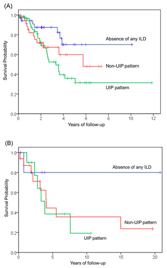 Subgroup survival analyses of patients with PPFE. Survival durations were estimated and compared using the Kaplan–Meier method and log-rank test, respectively. (A) Idiopathic PPFE patients were divided into three groups based on the following: (1) The presence of UIP pattern; (2) the presence of non-UIP pattern; (3) the absence of any ILD pattern in the lower lobes. Absence of any ILD versus non-UIP pattern (p = 0.16); absence of any ILD versus UIP pattern (p = 0.01); non-UIP pattern versus UIP pattern (p = 0.42). (B) Secondary PPFE patients were divided into three groups based on the following: (1) The presence of UIP pattern; (2) the presence of non-UIP pattern; (3) the absence of ILD pattern in the lower lobes. There were no statistical differences between the groups. Absence of any ILD versus non-UIP pattern (p = 0.33); absence of any ILD versus UIP pattern (p = 0.34); non-UIP pattern versus UIP pattern (p = 0.78).