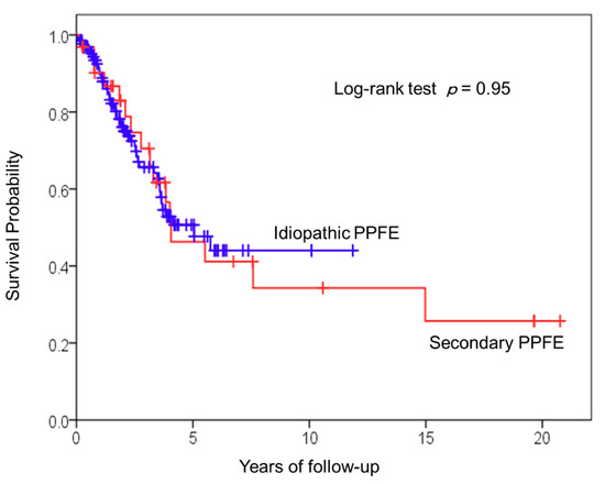 Survival analysis of idiopathic versus secondary PPFE. Kaplan-Meier survival curves show the number of idiopathic PPFE patients versus secondary PPFE patients. Survival curves for the two groups were similar (log-rank test, p = 0.95).