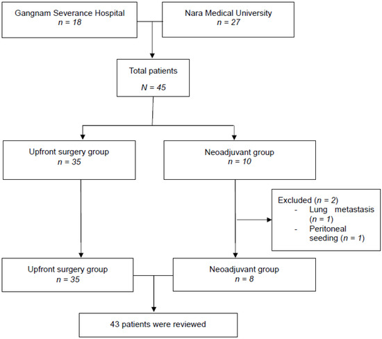 We retrospectively included 45 consecutive patients who were diagnosed for clinical T1 PDAC at Gangnam Severance Hospital (n = 18) and Nara Medical University Hospital (n = 27) between January 2010 and December 2017. All patients in this study had resectable PDAC according to NCCN. Borderline PDAC cases were not included. During the study period, 35 of the patients underwent upfront surgery and 10 received neoadjuvant treatment. However, two patients in the neoadjuvant treatment group did not undergo surgery due to the detection of distant metastasis after the completion of neoadjuvant treatment. Therefore, 43 patients with clinical T1 stage PDAC underwent pancreatectomy (Figure 1). The neoadjuvant therapy regimen comprised gemcitabine and concomitant radiation up to a cumulative dose of 54 Gy. One institution involved in this study has been performing neoadjuvant chemoradiotherapy in resectable pancreatic cancer patients since 2010. In accordance with the institutional policy, neoadjuvant chemoradiotherapy was performed in all patients after 2010.