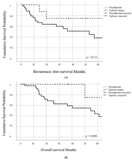 There was no significant difference in the RFS between the two study groups (p = 0.171). In the neoadjuvant group, the 1- and 3-year RFS rates were 87.5% and 75%, respectively. In the upfront surgery group, the 1- and 3-year RFS rates were 70.1% and 51.2%, respectively (median recurrence-free survival time; 53 months) (Figure 2A). There was no significant difference in the OS rate between the two study groups (p = 0.066). In the neoadjuvant and upfront surgery groups, the 3- and 5-year OS rates were 100% and 75%, and 62.9% and 43.9%, respectively (upfront surgery groups, median overall survival time; 54.5 months) (Figure 2B).