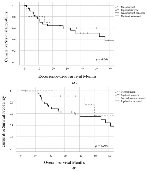 We analyzed all 45 patients (including 2 patients with distant metastasis) to evaluate the neoadjuvant treatment effectiveness. There was no significant difference in the RFS between the two study groups (p = 0.604). In the neoadjuvant group, the 1- and 3-year RFS rates were 80% and 60%, respectively. In the upfront surgery group, the 1- and 3-year RFS rates were 70.1% and 51.2%, respectively (median recurrence-free survival time; 53 months) (Figure 3A). There was no significant difference in the OS rate between the two study groups (p = 0.208). In the neoadjuvant and upfront surgery groups, the 3- and 5-year OS rates were 90% and 56.3%, and 62.9% and 43.9%, respectively (upfront surgery groups, median overall survival time; 54.5 months) (Figure 3B).