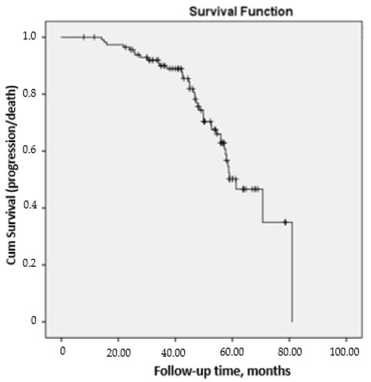 Survival curve was measured from v0 until the end of follow-up (v60) or progression/death in 116 patients at risk with RA-ILD under treatment with DMARDs.