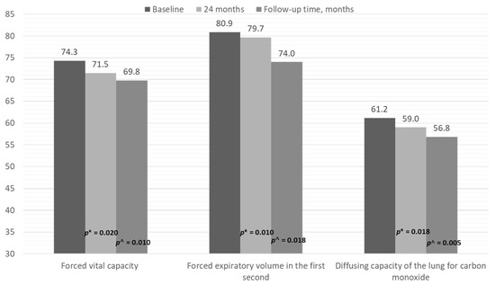 Progression of pulmonary function test results at the end of follow-up in patients with RA and ILD receiving DMARDs. * p-value for the comparison between 24 months and baseline; ^ p-value for the comparison between end of follow-up and baseline.
