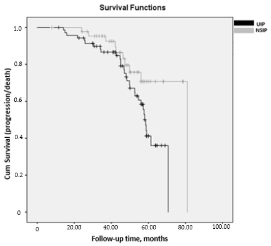 Kaplan–Meier survival curves measured from v0 until the end of follow-up (v60) or progression/death, stratified by radiological pattern in 116 patients at risk with RA-ILD. Survival was greater in patients with NSIP than in those with UIP (mean (95% CI), 70.0 months (63.5–76.5) vs. 55.7 months (51.6–59.8); p = 0.033, log-rank).